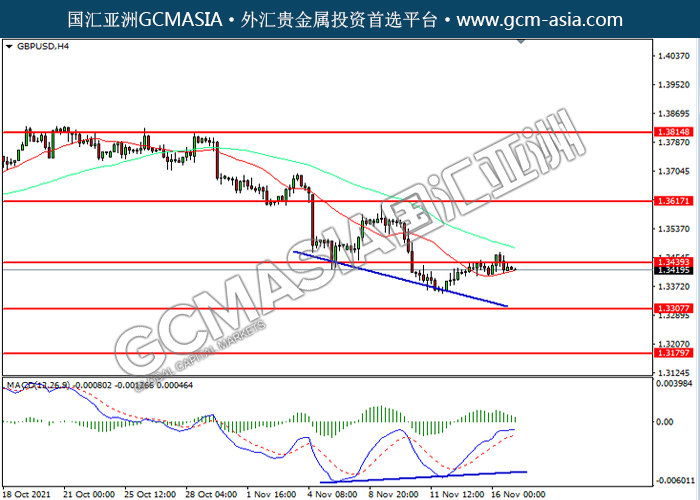 20211117 GBPUSD by willy | Nov 17, 2021 | 英镑兑美元 | 0 comments GBPUSD,H4:镑美震荡上行,目前测试前期压力。然而,MACD多头动能略减,短期可关注技术性回调为主。上方关注1.3440压力和1.3615压力,下方关注1.3395支撑和1.3180支撑。