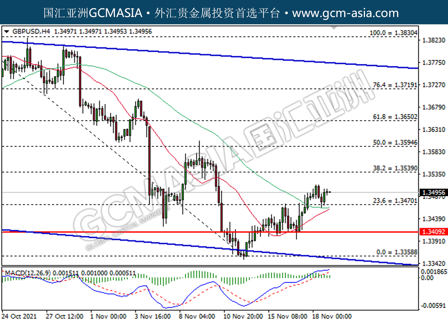 20211119 GBPUSD by willy | Nov 19, 2021 | 英镑兑美元 | 0 comments GBPUSD,H4:镑美震荡上行。MACD已形成金叉,动能偏强,短期关注多头势力为主。上方关注1.3540压力和1.3595压力,下方关注1.3470支撑和1.3410支撑。