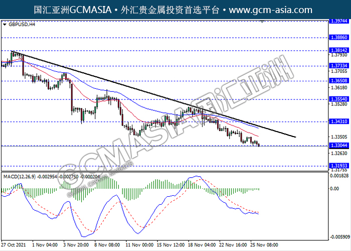 20211126 GBPUSD-午间 by willy | Nov 26, 2021 | 英镑兑美元 | 0 comments GBPUSD,H4:镑美空头排列,目前测试前期支撑。MACD动能持续略减,若突破继续看空为主。上方关注1.3430压力和1.3555压力,下方关注1.3305支撑和1.3195支撑。