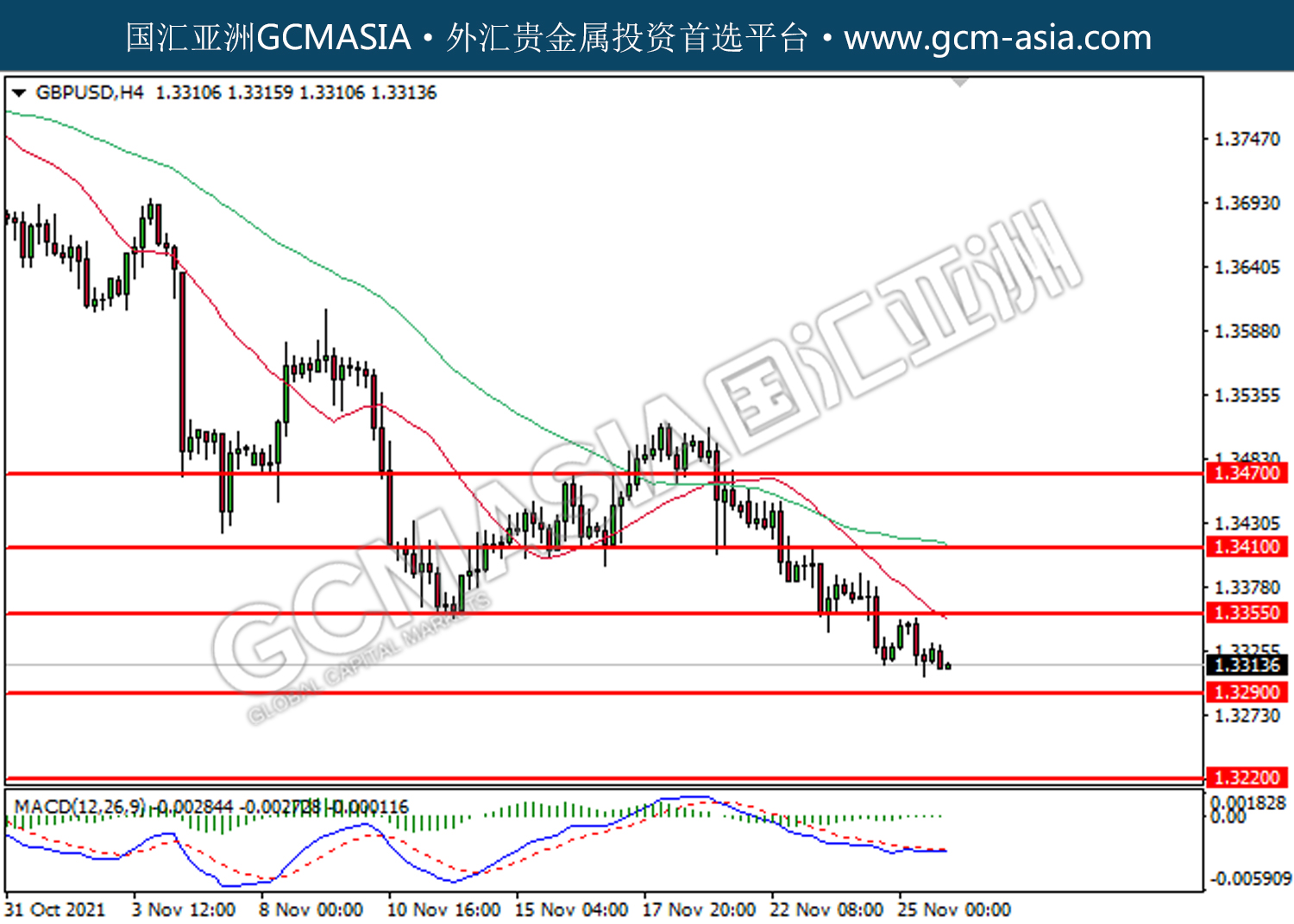 20211126 GBPUSD by willy | Nov 26, 2021 | 英镑兑美元 | 0 comments GBPUSD,H4:镑美震荡下行。MACD多头头动能有所略减,短期关注空头势力。上方关注1.3355压力和1.3410压力,下方关注1.3290支撑和1.3220支撑。