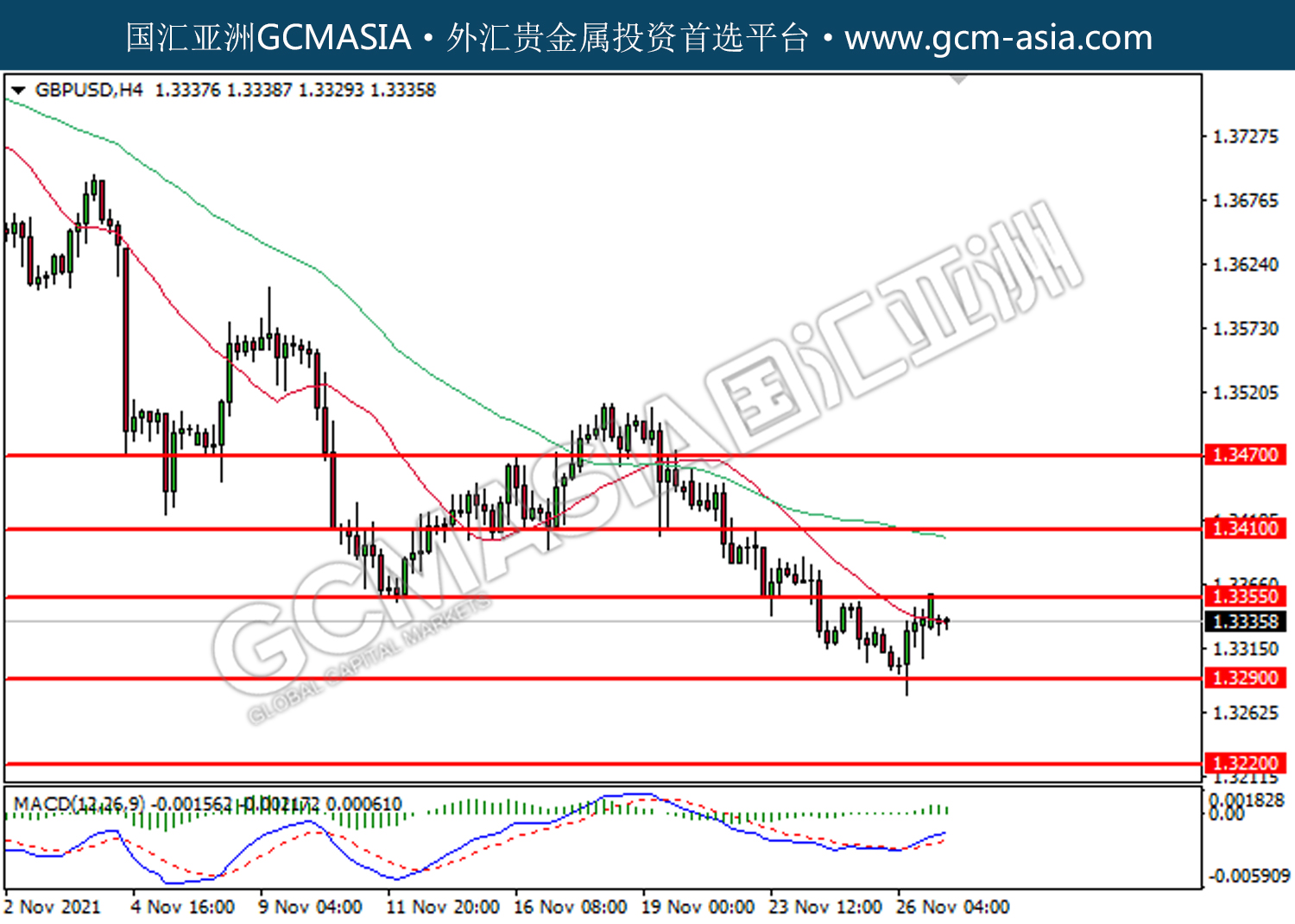 20211129 GBPUSD by willy | Nov 29, 2021 | 英镑兑美元 | 0 comments GBPUSD,H4:镑美受承压回落。MACD多头动能有所略减,短期关注空头势力。上方关注1.3355压力和1.3410压力,下方关注1.3290支撑和1.3220支撑。