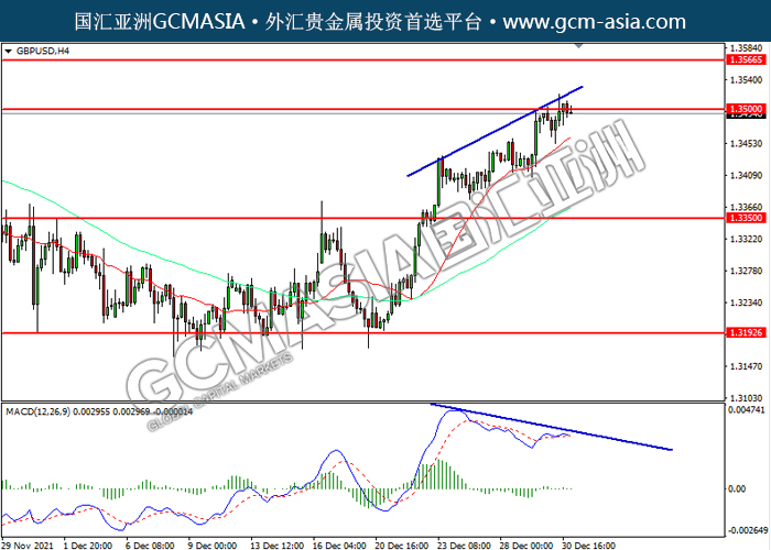 20211231 GBPUSD-午间 by willy | Dec 31, 2021 | 英镑兑美元 | 0 comments GBPUSD,H4:镑美震荡上行,目前测试前期压力。然而,MACD多头动能略减,短期可关注技术性回调为主。上方关注1.3500压力和1.3625压力,下方关注1.3350支撑和1.3195支撑。