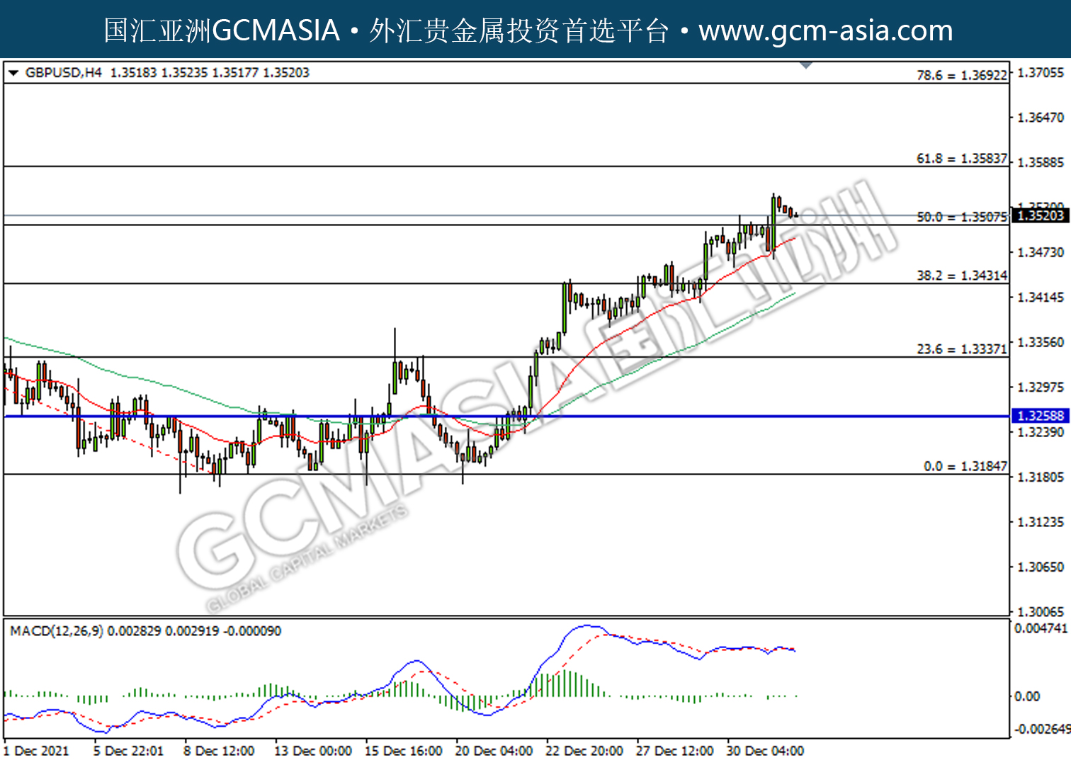 GBPUSD,H4:镑美受承压回落。MACD多头动能有所略减,短期关注技术性回调。上方关注1.3585和1.3690压力,下方关注1.3510支撑和1.3430支撑。