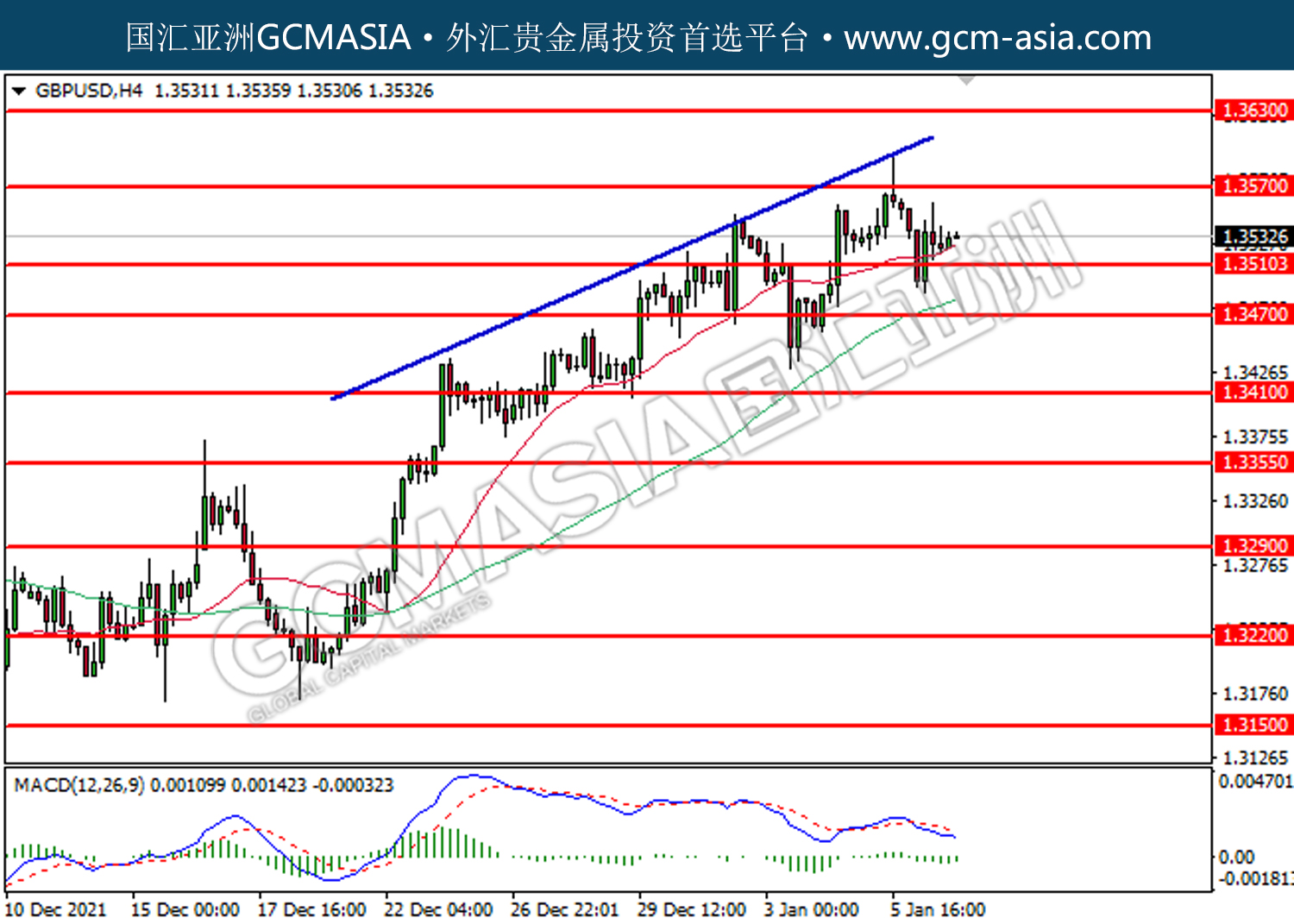 20220107 GBPUSD by willy | Jan 7, 2022 | 英镑兑美元 | 0 comments GBPUSD,H4:镑美低位反弹。MACD空头动能有所略减,短期关注多头势力。上方关注1.3570和1.3630压力,下方关注1.3510支撑和1.3470支撑。
