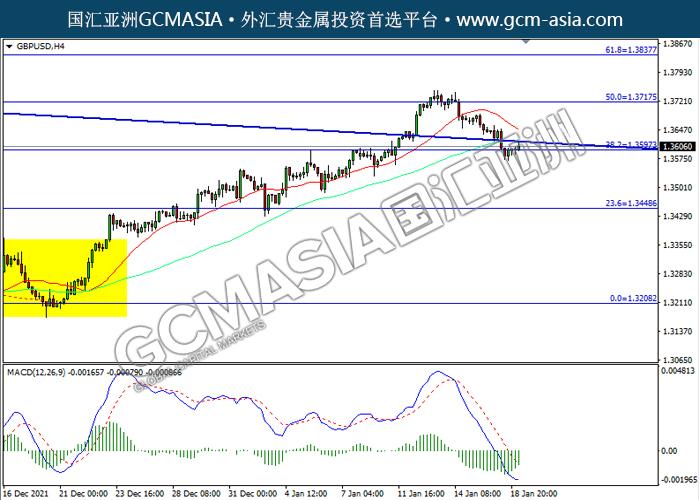 20220119 GBPUSD-午间 by willy | Jan 19, 2022 | 英镑兑美元 | 0 comments GBPUSD,H4:镑美高位回落,目前测试前期支撑。然而,MACD空头动能略减,短期关注技术性回调为主。上方关注1.3715压力和1.3840压力,下方关注1.3595支撑和1.3450支撑。