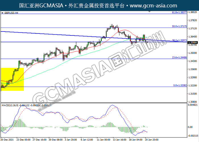 20220121 GBPUSD-午间 by willy | Jan 21, 2022 | 英镑兑美元 | 0 comments GBPUSD,H4:镑美高位回落,目前测试前期支撑。MACD空头动能略增,若下破可关注空头为主。上方关注1.3715压力和1.3840压力,下方关注1.3595支撑和1.3450支撑。