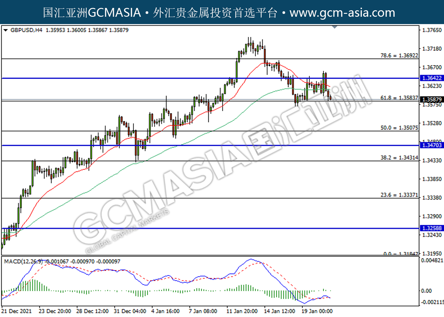 20220121 GBPUSD by willy | Jan 21, 2022 | 英镑兑美元 | 0 comments GBPUSD,H4:镑美高位承压回落。MACD已形成死叉,动能转弱,若下破可继续看空。上方关注1.3640压力和1.3690压力,下方关注1.3585支撑和1.3510支撑。