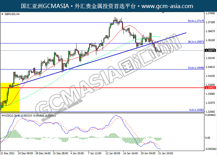 20220124 GBPUSD-午间 by willy | Jan 24, 2022 | 英镑兑美元 | 0 comments GBPUSD,H4:镑美下破前期支撑。然而,MACD空头动能略减,短期可关注技术性回调为主。上方关注1.3595压力和1.3715压力,下方关注1.3450支撑和1.3340支撑。
