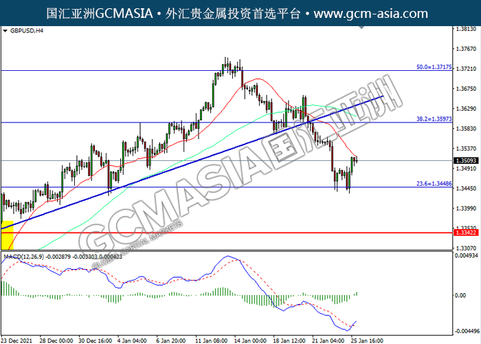20220126 GBPUSD-午间 by willy | Jan 26, 2022 | 英镑兑美元 | 0 comments GBPUSD,H4:镑美低位反弹。MACD多头动能略增,短期可关注多头为主。上方关注1.3595压力和1.3715压力,下方关注1.3450支撑和1.3340支撑。