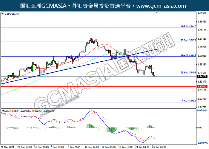 GBPUSD,H4:镑美下破前期支撑,持续下行。MACD空头动能略增,短期可关注空头为主。上方关注1.3450压力和1.3595压力,下方关注1.3340支撑和1.3210支撑。