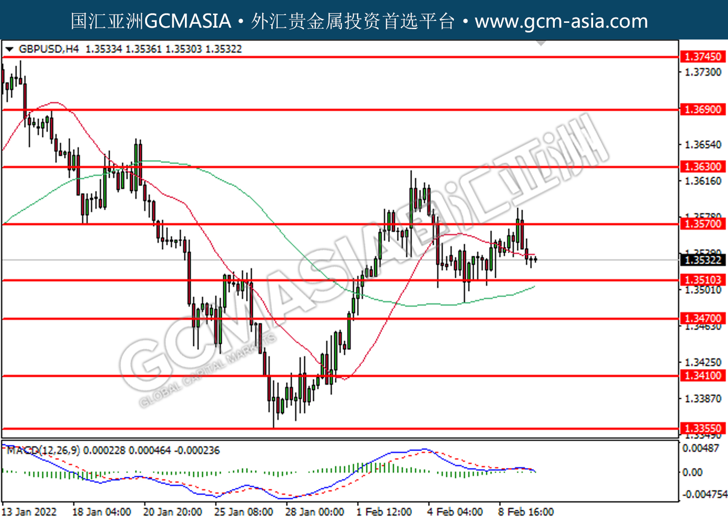 GBPUSD,H4:镑美受承压回落。MACD已形成死叉,动能转弱,短期关注空头为主。上方关注1.3570压力和1.3630压力,下方关注1.3510支撑和1.3470支撑。