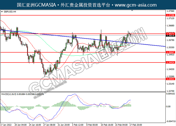 GBPUSD,H4:镑美震荡上行,目前测试前期压力。然而,MACD多头动能略减,短期可关注技术性回调为主。上方关注1.3615压力和1.3730压力,下方关注1.3505支撑和1.3440支撑。