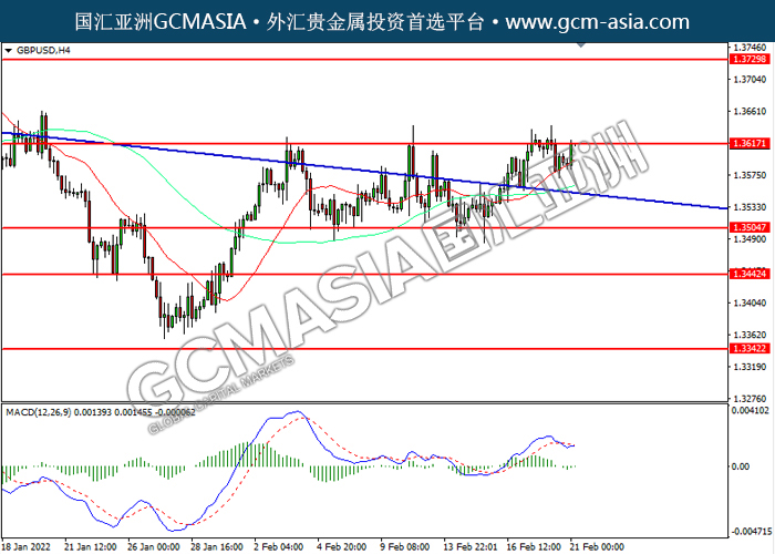 20220221 GBPUSD-午间 by willy | Feb 21, 2022 | 英镑兑美元 | 0 comments GBPUSD,H4:镑美震荡上行,目前测试前期压力。MACD空头动能略减,若突破可关注多头为主。上方关注1.3615压力和1.3730压力,下方关注1.3505支撑和1.3440支撑。