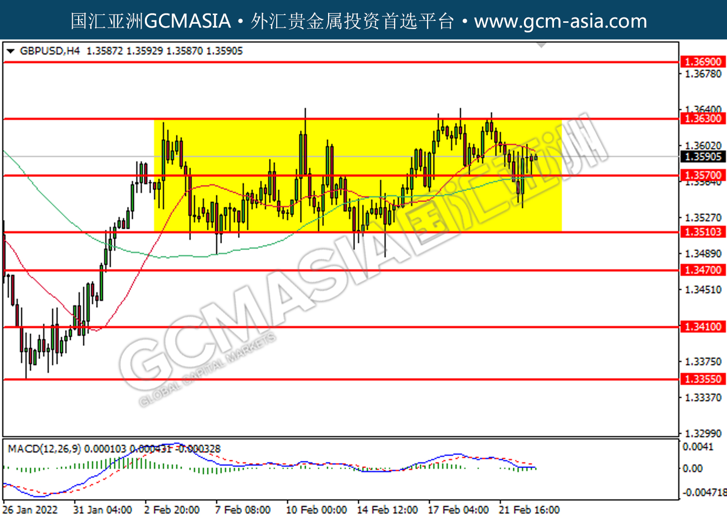 20220223 GBPUSD by willy | Feb 23, 2022 | 英镑兑美元 | 0 comments GBPUSD,H4:镑美受承压回落。MACD已形成死叉,动能转弱,短期关注空头为主。上方关注1.3630压力和1.3690压力,下方关注1.3570支撑和1.3510支撑。