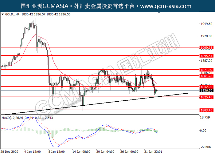 030221 GOLD_ by willy | Feb 3, 2021 | 黄金 | 0 comments GCMAsia-GOLD GOLD 2021-02-03 GOLD_,H4:黄金突破后持续下行。MACD转向空头,动能略减,短期可关注空头趋势为主。上方关注1842.90压力和1861.75压力,下方关注1825.40支撑和1803.40支撑。