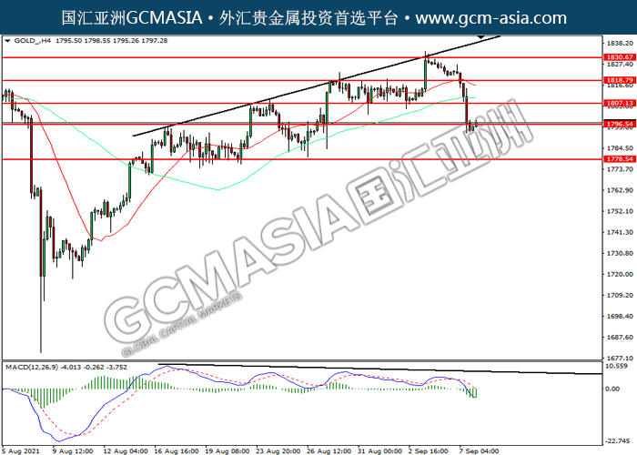 20210908 GOLD by willy | Sep 8, 2021 | 黄金 | 0 comments GOLD_,H4:黄金震荡下行,目前测试前期支撑。MACD空头动能略增,若下破可关注空头为主。上方关注1807.10压力和1818.80压力,下方关注1796.55支撑和1778.55支撑。