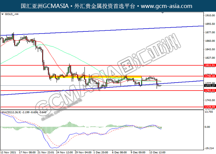 151221 GOLD by willy | Dec 15, 2021 | 黄金 | 0 comments GOLD_,H4:黄金震荡下行。MACD空头动能略增,短期可关注空头为主。上方关注1790.20压力和1811.50压力,下方关注1762.00支撑和1729.60支撑。