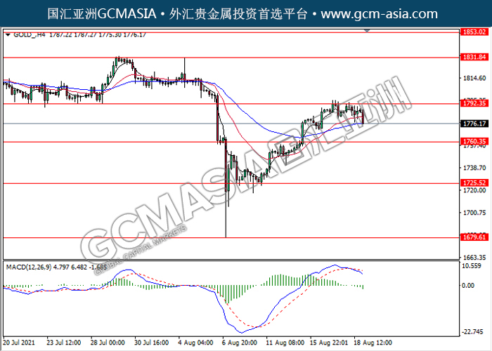 190821 GOLD-午间 by keyk | Aug 19, 2021 | 黄金 | 0 comments GOLD_,H4:黄金高位承压回落。MACD形成死叉,动能略减,短期继续关注空头回调为主。上方关注1792.35压力和1831.85压力,下方关注1760.35支撑和1725.50。