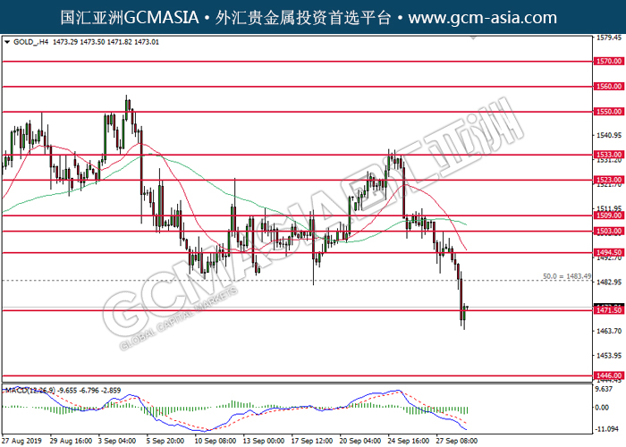 GOLD_,H4:黄金低位反弹。MACD空头动能有所略减,短期关注技术性回调。上方关注1483.50压力和1494.50压力,下方关注1471.50支撑和1446.00支撑。