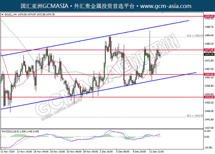 GOLD_,H4:黄金受承压回落。MACD多头动能有所略减,短期关注技术性回调。上方关注1477.00压力和1483.60压力,下方关注1464.50支撑和1453.00支撑。