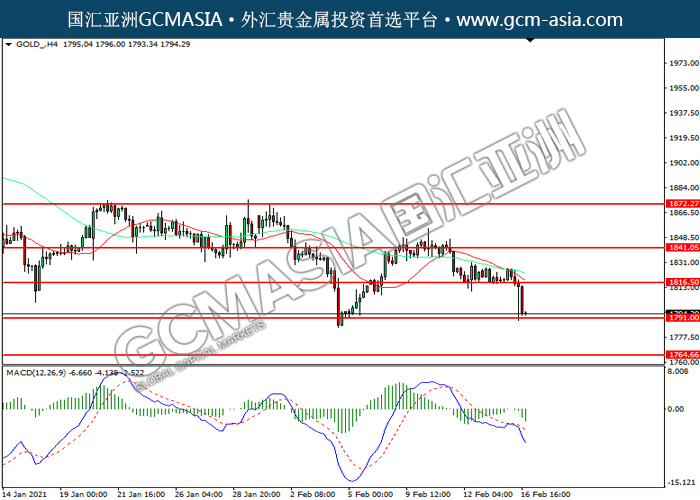 GOLD_,H4:黄金震荡下行,目前测试前期支撑。MACD空头动能略增,若下破可关注空头为主。上方关注1816.50压力和1841.05压力,下方关注1791.00支撑和1764.65支撑。