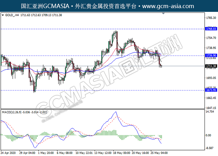20200527 GOLD by keyk | May 27, 2020 | 黄金 | 0 comments GCMAsia - GOLD GOLD 2020-05-27 GOLD_,H4:黄金突破前期支撑,空头排列。MACD动能略减,中期继续看空为主。上方关注1726.90压力和1768.05压力,下方关注1673.95支撑和1637.40支撑。