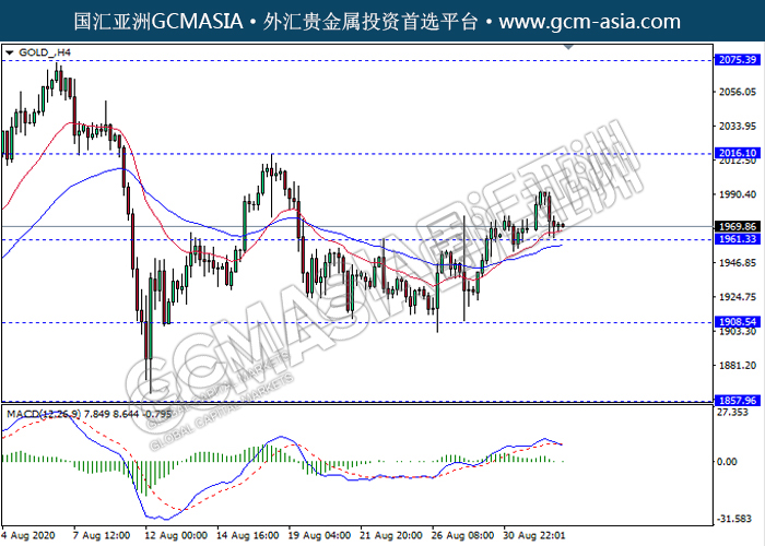 GOLD_,H4:黄金近期高位承压回落,目前测试靠近前期支撑。MACD形成死叉,动能略减,若突破继续看空为主。上方关注2016.10压力和2075.40压力,下方关注1961.35支撑和1908.55支撑。