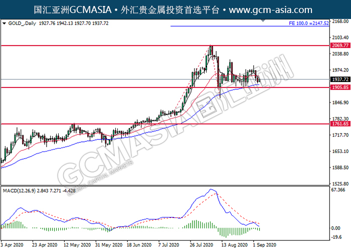 GOLD_,Daily:黄金高位承压后回落。MACD空头动能略增,短期可持续关注空头走势为主。上方关注2067.75压力和2147.50压力,下方关注1905.85支撑和1761.65支撑。