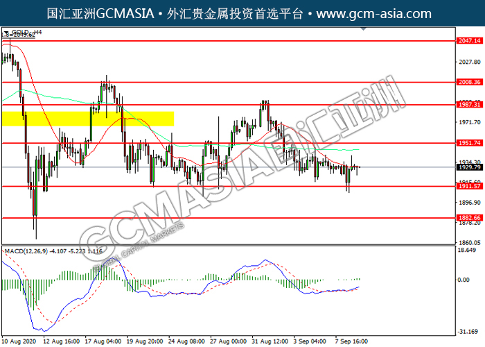 20200909 GOLD-午间 by keyk | Sep 9, 2020 | 黄金 | 0 comments GCMAsia - GOLD GOLD 2020-09-09 GOLD_,H4:黄金低位反弹。MACD多头动能略增,短期继续看多为主。上方关注1951.75压力和1987.30压力,下方关注1911.55支撑和1882.65支撑。
