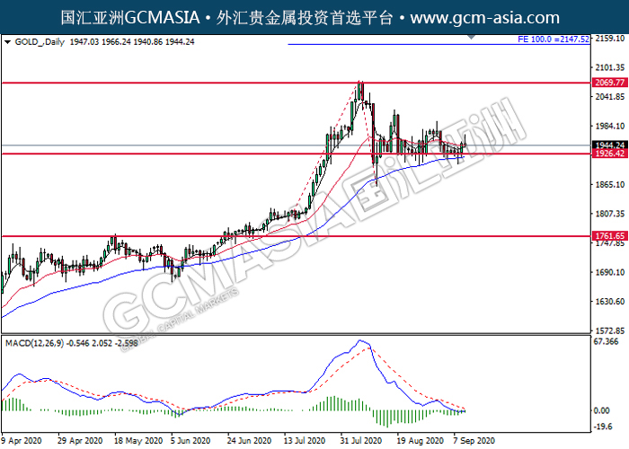 20200911 GOLD_ by willy | Sep 11, 2020 | 黄金 | 0 comments GCMAsia-GOLD GOLD 2020-09-11 GOLD_,Daily:黄金低位反弹。MACD空头动能略减,中期可持续关注多头走势为主。上方关注2069.75压力和2147.50压力,下方关注1926.40支撑和1761.65支撑。