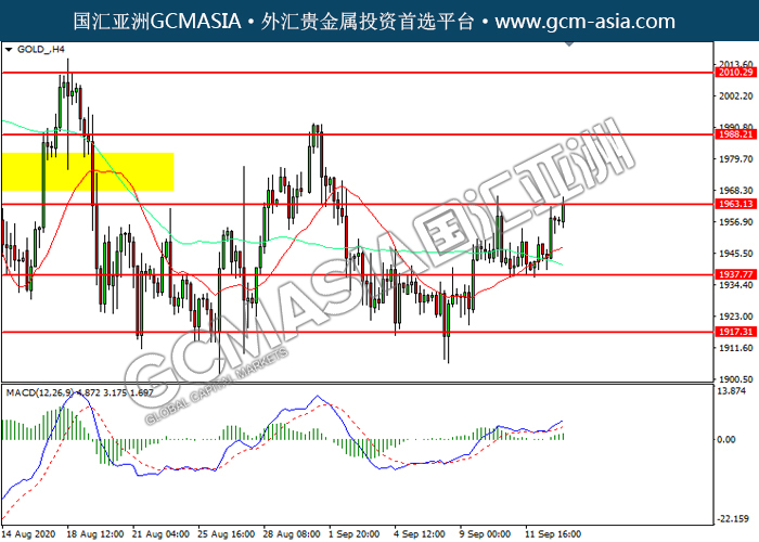 GOLD_,H4:黄金震荡上行,目前测试前期压力。MACD显示多头信号,动能略增,若突破可关注多头方向为主。上方关注1963.15压力和1988.20压力,下方关注1937.75支撑和1917.30支撑。