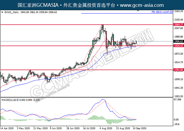 20200915 GOLD_ by willy | Sep 15, 2020 | 黄金 | 0 comments GCMAsia-GOLD GOLD 2020-09-15 GOLD_,Daily:黄金低位反弹。MACD空头动能略减,中期可持续关注多头走势为主。上方关注2069.75压力和2147.50压力,下方关注1926.40支撑和1761.65支撑。