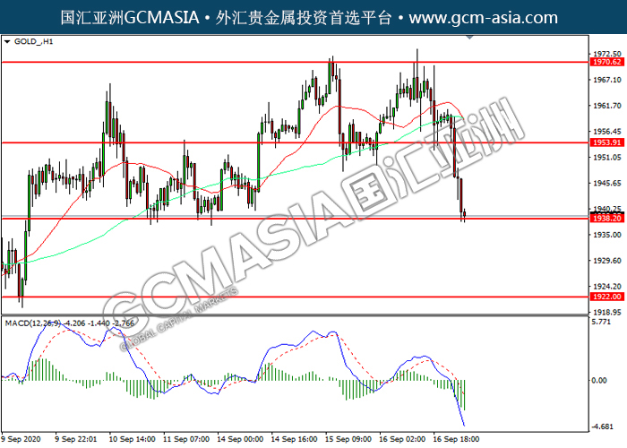 GOLD_,H1:黄金空头排列,目前测试前期支撑。MACD空头动能略增,若下破可关注空头为主。上方关注1953.90压力和1970.60压力,下方关注1938.20支撑和1922.00支撑。