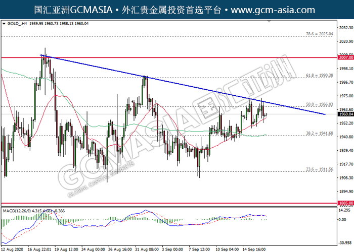 20200917 GOLD by willy | Sep 17, 2020 | 黄金 | 0 comments GCMAsia - GOLD GOLD_ 2020-09-17 GOLD_,H4:黄金受承压回落。MACD已形成死叉,动能转弱,短期关注空头势力。上方关注1966.00压力和1990.40压力,下方关注1941.70支撑和1911.55支撑。