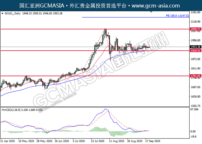20200921 GOLD-午间 by skylow | Sep 21, 2020 | 黄金 | 0 comments GCMAsia - GOLD GOLD 2020-09-21 GOLD_,Daily:黄金低位反弹。MACD空头动能略减,中期可持续关注多头走势为主。上方关注2069.75压力和2147.50压力,下方关注1926.40支撑和1761.65支撑。