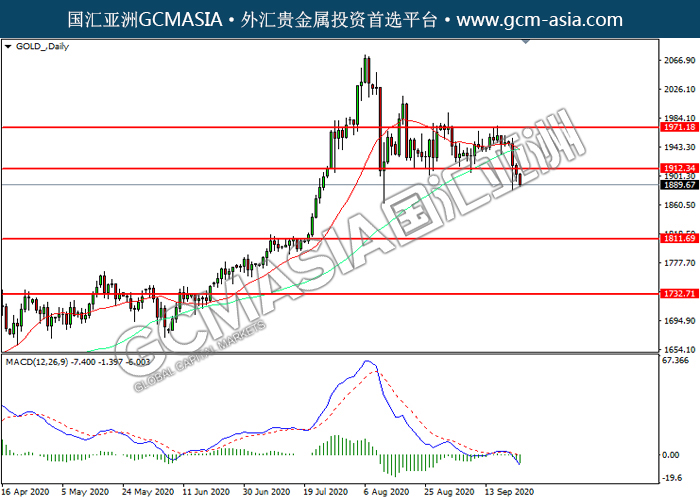 GOLD_,Daily:黄金突破后持续下行。MACD空头动能转强,中期可持续关注空头走势为主。上方关注1912.35压力和1971.20压力,下方关注1811.70支撑和1732.70支撑。
