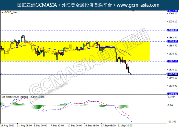 GOLD_,H4:黄金空头排列,目前测试前期支撑。MACD动能持续略减,若突破继续看空为主。上方关注1902.20压力和1970.55压力,下方关注1857.95支撑和1790.05支撑。