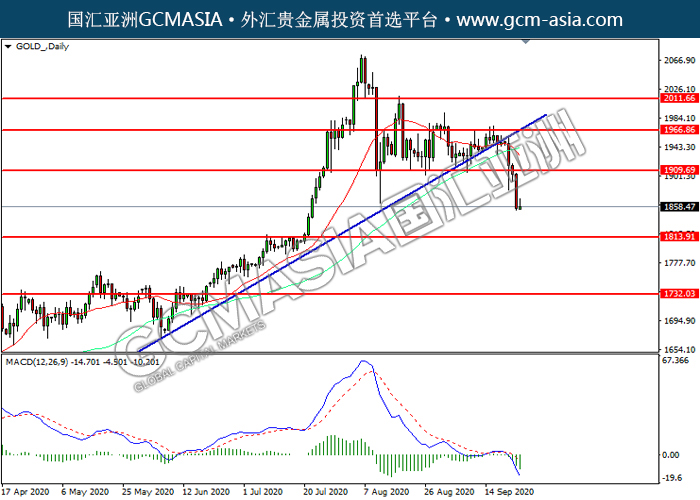 GOLD_,Daily:黄金突破后持续下行。MACD空头动能转强,中期可持续关注空头走势为主。上方关注1909.70压力和1966.85压力,下方关注1813.90支撑和1732.05支撑。