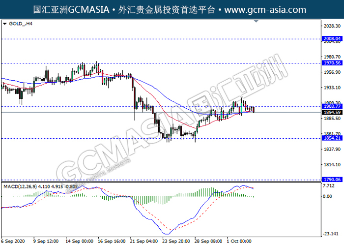 20201005 GOLD-午间 by keyk | Oct 5, 2020 | 黄金 | 0 comments GCMAsia - GOLD GOLD 2020-10-05 GOLD_,H4:黄金高位承压回落。MACD形成死叉,动能略减,短期继续看空回调为主。上方关注1903.75压力和1970.55压力,下方关注1854.20支撑和1790.05支撑。