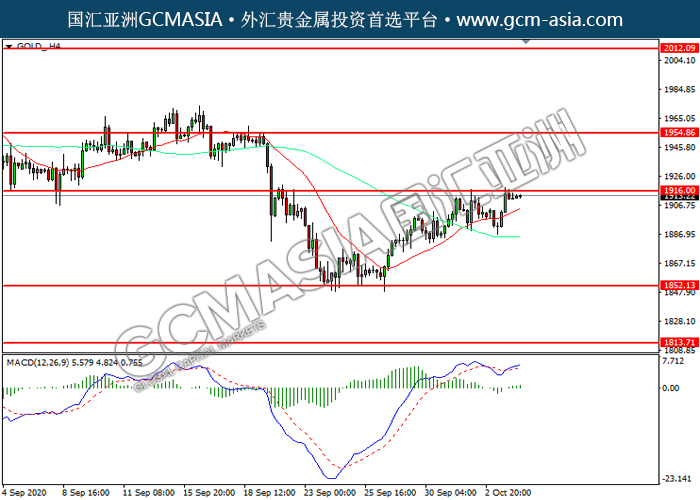 GOLD_,H4:黄金震荡上行,目前测试前期压力。MACD多头动能略增,若突破可关注多头为主。上方关注1916.00压力和1954.85压力,下方关注1852.15支撑和1813.70支撑。