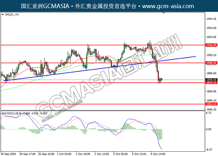 GOLD_,H1:黄金空头排列,目前测试前期支撑。然而,MACD空头动能略减,短期可关注技术性回调为主。上方关注1896.55压力和1916.00压力,下方关注1875.15支撑和1852.15支撑。