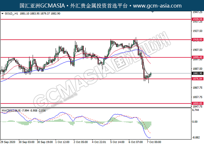 20201007 GOLD-午间 by keyk | Oct 7, 2020 | 黄金 | 0 comments GCMAsia - GOLD GOLD 2020-10-07 GOLD_,H1:黄金低位反弹。MACD转向多头,动能略增,短期关注多头为主。上方关注1899.40压力和1918.00压力,下方关注1876.85支撑和1850.85支撑。