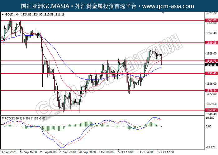 GOLD_,H4:黄金高位承压后回落,目前测试着支撑位。MACD转向空头,动能略减,若成功收线在支撑位下方可持续关注空头为主。上方关注1915.75压力和1939.60压力,下方关注1899.40支撑和1876.85支撑。