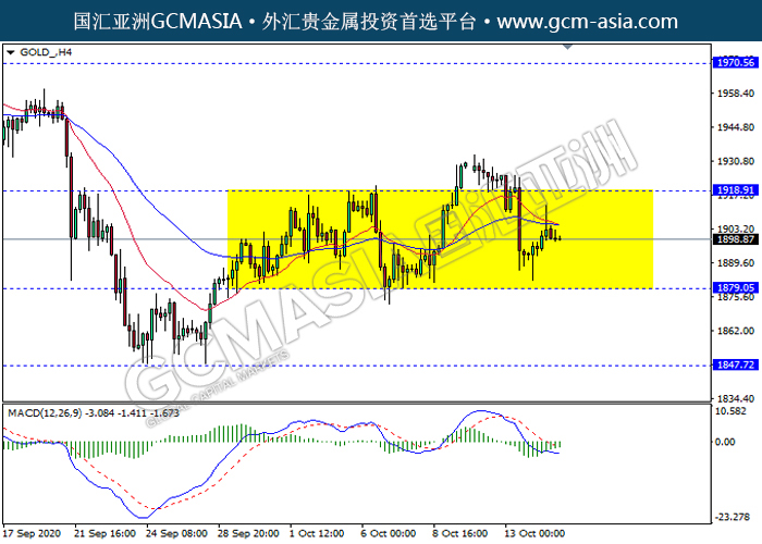 GOLD_,H4:黄金仍区间交易。然而,MACD仍显示多头信号,空头动能有所略减,短期关注多头方向为主。上方关注1918.90压力和1970.55压力,下方关注1879.05支撑和1847.70支撑。