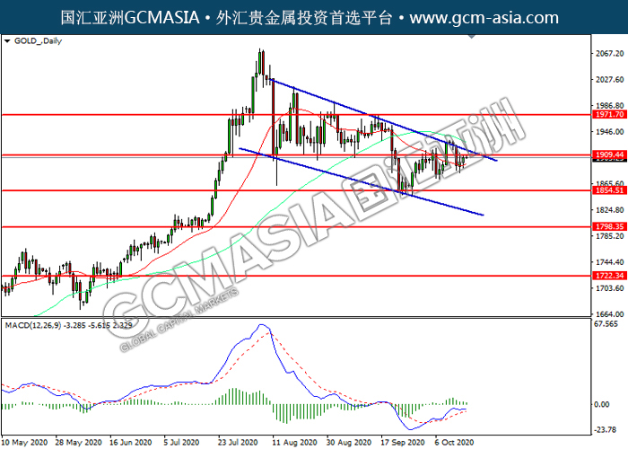 GOLD_,Daily:黄金震荡上行,目前测试前期压力。然而,MACD多头动能略减,短期可关注技术性回调。上方关注1909.45压力和1971.70压力,下方关注1854.50支撑和1798.35支撑。