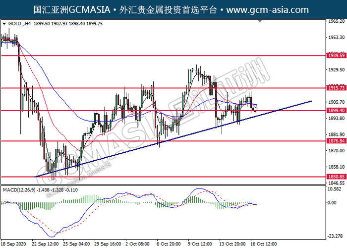 GOLD_,H4:黄金低位反弹。由于MACD并没有显示任何信号,建议等到更多信号后才进入市场。上方关注1915.75压力和1939.60压力,下方关注1899.40支撑和1876.85支撑。