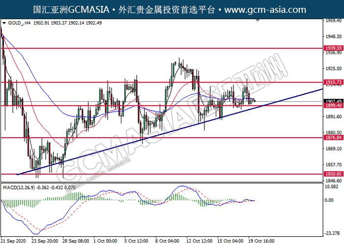 GOLD_,H4:黄金低位反弹。由于MACD并没有显示任何信号,建议等到更多信号后才进入市场。上方关注1915.75压力和1939.60压力,下方关注1899.40支撑和1876.85支撑。