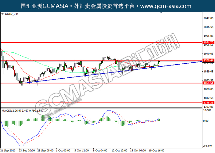 GOLD_,H4:黄金震荡上行,目前测试前期压力。MACD多头动能略增,若突破可关注多头为主。上方关注1920.45压力和1971.70压力,下方关注1854.50支撑和1798.35支撑。