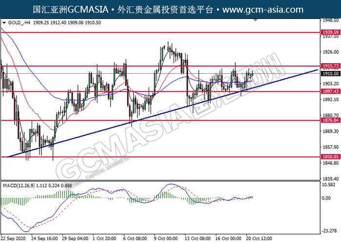 20201021 GOLD_ by willy | Oct 21, 2020 | 黄金 | 0 comments GCMAsia-GOLD GOLD 2020-10-21 GOLD_,H4:黄金低位反弹。MACD显示多头信号,动能略增,短期可关注多头为主。上方关注1915.75压力和1939.60压力,下方关注1897.45支撑和1876.85支撑。