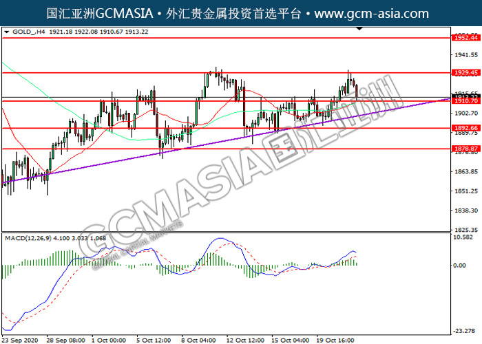 GOLD_,H4:黄金高位回落,目前测试前期支撑。MACD多头动能略减,若下破可关注空头为主。上方关注1929.45压力和1952.45压力,下方关注1910.70支撑和1892.65支撑。